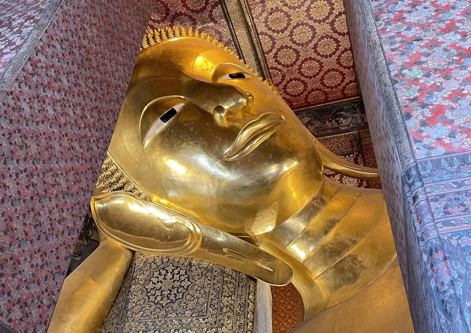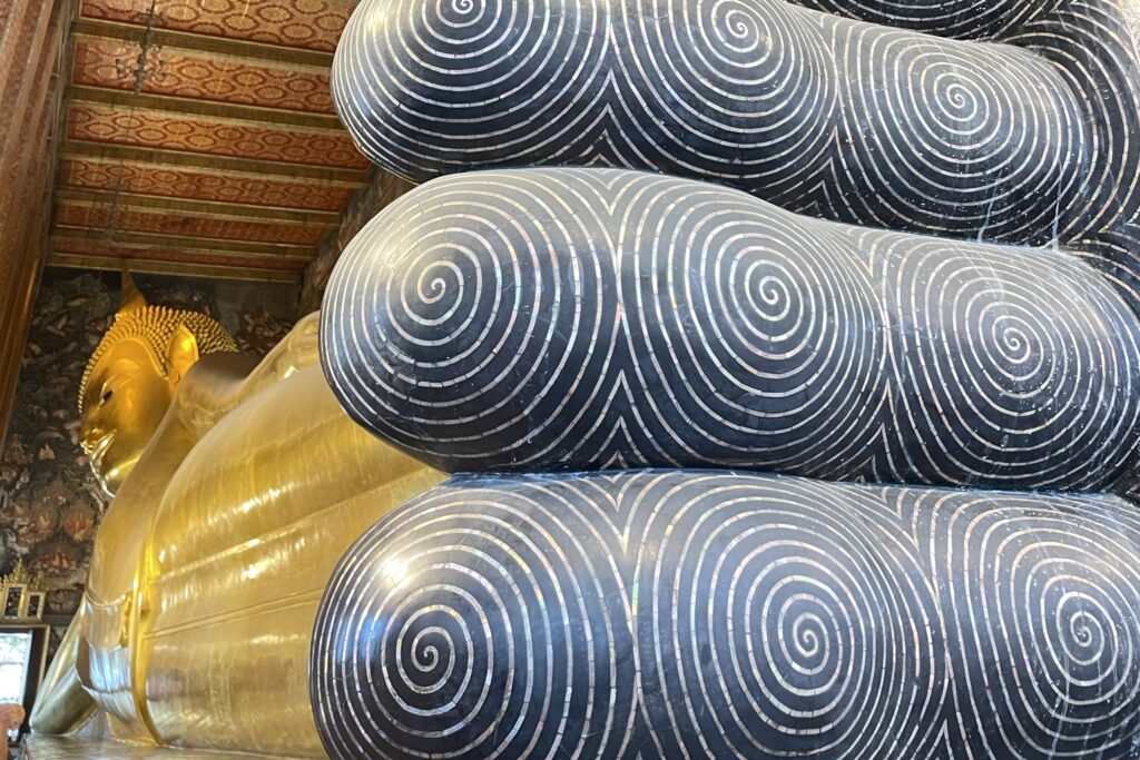 ワット・ポーといえば、全長46m・高さ15mの黄金の涅槃仏が最大の見どころ。堂内いっぱいに横たわるその姿は圧巻で、仏像の周りをぐるっと1周できるのも魅力です。足裏に施された螺鈿細工(らでん)の装飾も必見。
